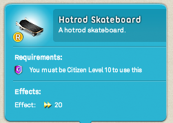 Presenting… the Hotrod Skateboard! It’s perfect for racing around on, and very exclusive. It’s not available in shops, so it’s guaranteed to be rare – only your one-year VIP friends will have it.