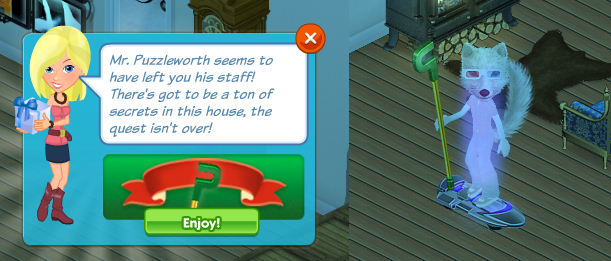 Tras esto, Puzzleworth te hablará. Las opciones de diálogo no importan: la misión habrá terminado y recibirás el Puzzleworth Staff.